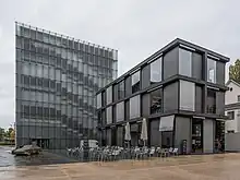 | Kunsthaus står i lyset af Bodensøen. Dens krop er lavet af glasplader, stål og en stenmasse af støbt beton