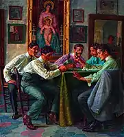 Det var imidlertid ikke kun elever, der kom forbi Civita d'Antino, hvor Zahrtmann lejede sig ind hos familien Cerroni ved Porta Flora.[6]. For eksempel kom nygifte Marie og Peder Severin Krøyer på besøg i 1890, og Krøyer fik lejlighed til at udføre et af sine syv billeder af kunstnere omkring et bord. Krøyer skrev om Zahrtmann: