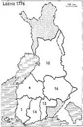![]() Finlands län 1776: 1: Åbo och Björneborg, 4: Vasa, 10: Uleåborg, 14: Nyland och Tavastehus, 15: Kymmenegård, 16: Savolax och Karelen |