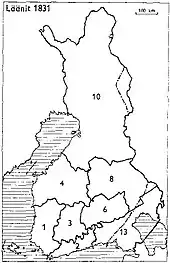 ![]() Finlands län 1831: 1: Åbo och Björneborg, 2: Nyland, 3: Tavastehus, 4: Vasa, 6: S:t Michel, 8: Kuopio, 10: Uleåborg, 13: Viborg |