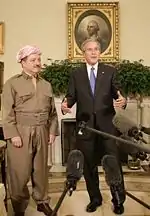 Præsident George W. Bush taler til nogle reportere, mens han byder Massoud Barzani, KRG's præsident, velkommen til Det ovale værelse i Det Hvide Hus tirsdag, 25. oktober 2005