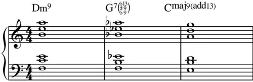 Det i forvejen komplekse lydbillede tillader brugen af andre skalaer til opbygning af akkorderne. Eksempler på dette kan være brug af den altererede skala, dim-skalaerne eller en heltoneskala i forbindelse med opbygningen af en dominantisk akkord. De altererede toner fungerer som ledetoner til den følgende akkord – oftest tonika. Dette kan ses i eksemplet herunder:
