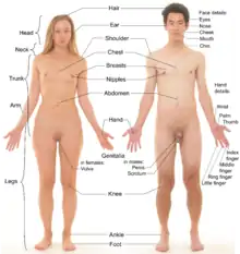 Fotografi af en voksen kvinde, sammenlignet med en voksen mand. Bemærk, at kropsbehåring er fjernet fra begge modeller.