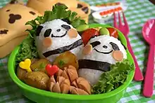 En kyaraben, som indeholder riskugler, formet til pandaer.
