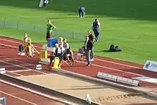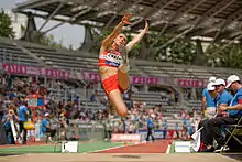 Emmanuelle Chazal deltager i kvindernes syvkamps længdesprings finale under det fransk atletisk mesterskab 2013 i Stade Charléty i Paris, 13. juli 2013.