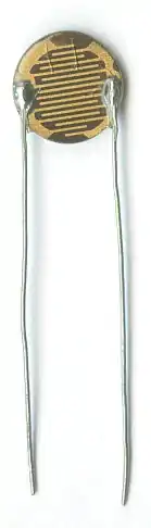 Et billede af en typisk LDR-modstand. De gullige metaliske gaffler er ledningsbaner. Det brune mellem de 2 ledningsgafler er det fotofølsomme materiale.