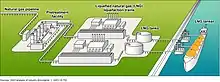 LNG-terminaler omfatter faciliteter til lastning og losning af tankskibe samt store lagertanke. Efter losningen distribueres den flydende naturgas videre til kunderne ved hjælp af rørledninger eller lastbiler. LNG-eksportterminaler har faciliteter til likvefaktion, importterminaler til genfordampning af naturgassen. For at kunne distribuere naturgassen videre til kunderne må gassen altså først opvarmes og omdannes.
