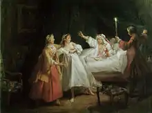 En scene fra La Fontaines fortælling Le Gascon Puni, maleri af Nicolas Lancret, Musée du Louvre.