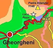 ![]() Lacul Roșu Lacul Roșus beliggenhed 46.78931°N 25.7869°Ø | |