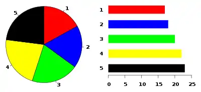 Lagkagediagram. Til sammenligning vises til højre et søjlediagram der angiver de samme størrelser. Søjlediagrammet er lettest at aflæse.