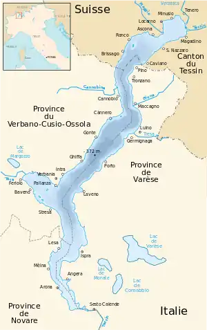 Søens stejle bredder er omgivet af Piemonte og Lombardiets Foralper. Vestbredden er i Piemonte (Novara og Verbano-Cusio-Ossola-provinsen), den østlige del i Lombardiet (Varese-provinsen), og den nordligste del strækker sig 13 kilometer ind i Schweiz og er det laveste punkt i hele landet.