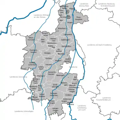 ![]() Beliggenheden af Landkreis Augsburg i Bayern (klikbart kort) | |