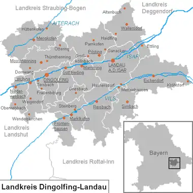 ![]() Beliggenheden af Landkreis Dingolfing-Landau i Bayern (klikbart kort) | |