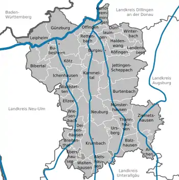 ![]() Beliggenheden af Landkreis Günzburg i Bayern (klikbart kort) | |