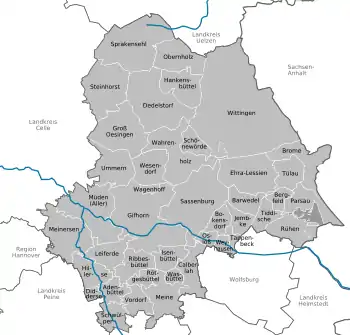 - Mod nordøst danner Ohre på nogle strækninger grænse til Sachsen-Anhalt. Den har sit udspring ved Wittingen (Ohrdorf).