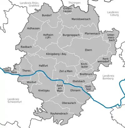 ![]() Beliggenheden af Landkreis Haßberge i Bayern (klikbart kort)  | |