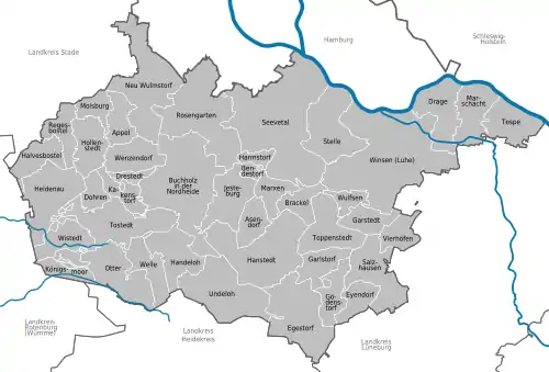Den største by i landkreisen er Buchholz in der Nordheide. Den største kommune er Seevetal, der med over 40.000 indbyggere er den i tyskland med flest indbyggere, som ikke har stadsret.