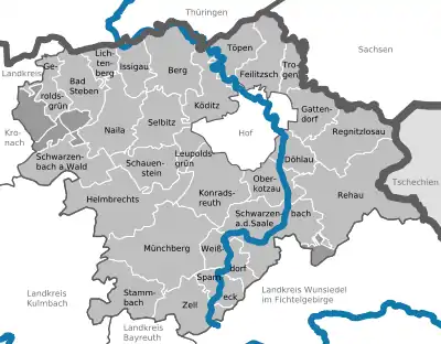 ![]() Beliggenheden af Landkreis Hof i Bayern (klikbart kort)  | |