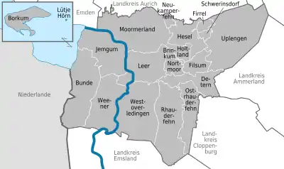 Det ubeboede område Lütje Hörn ligger også i Landkreis Leer district men er kommunefrit område.