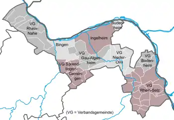 Ingelheim am Rhein er kreisens hovedby. Her blev den danske konge Harald Klak døbt i år 826, og herfra drog munken Ansgar ud som Nordens apostel. Byerne Nieder-Olm og Bingen am Rhein ligger også i kreisen.