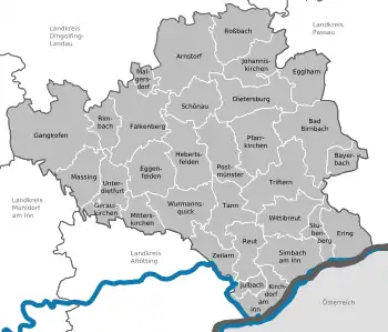 ![]() Beliggenheden af Landkreis Rottal-Inn i Bayern (klikbart kort) | |