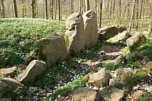 - Senere langdysser har stenkammer; men er ikke bygget, så der kan have været en overligger. Der findes rester af en brændt planke-overdækning.