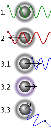 | 3.3 | Atomet reemiterer efterfølgende en foton. Over flere absorptioner og reemissioner vil retningen være tilfældig, og impulsen vil derfor ikke ændre sig. |