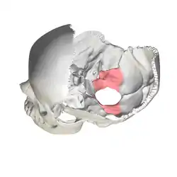 ![]() Det menneskelige kranium set ovenfra (parietalknoglerne fjernet). Laterale dele af nakkebenet er vist med rød. | |