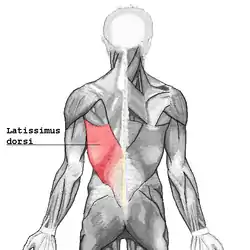 | Aktioner | Adduktere, ekstendere og roterer armen indad, når hæftningen bevæges mod dets udspring. Når muskelbevægelsen observeres fra udspringet mod hæftningen, er latissimus en meget kraftfuld rotator af torsoen. |