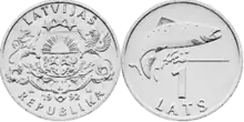 1 lats-mønten havde en diameter på 21,75 mm, den vejede 4,8 g og bestod af kobbernikkel. Den var sølvfarvet og på randen stod der LATVIJAS BANKA(Letlands bank) 2 gange adskilt af 2 punkter.