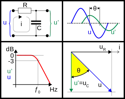 Nederst til højre på illustrationen ses et phasordiagram for lavpasleddet: Da modstandens størrelse er et reelt tal og kondensatorens impedans et imaginært, bliver summen af spændingerne over komponenterne et komplekst tal. Et sted i den komplekse plan findes phasoren for indgangsspændingen, som ifølge Kirchhoffs spændingslov skal være summen af de to seriekoblede komponenter i leddet: Afhængigt af frekvensen, og dermed kondensatorens reaktans, danner denne phasor en vis vinkel θ i forhold til phasoren for spændingen over kondensatoren, som jo samtidig er udgangsspændingen fra lavpasleddet.