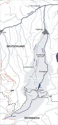 Floden løber videre nordover hvor den danner grænse mellem Schwaben og Oberbayern , gennem et område kaldet Lechrain og gennem byerne Schongau, Landsberg, Augsburg (hvor den løber sammen med Wertach) og Rain, før den løber ud i Donau lidt forbi Donauwörth. Der er ikke mulighed for transport på floden på grund af de stride strømme og stundom grunde gruspartier. Fra slottet Neuschwanstein, nær Füssen, kan man få et flot udsyn over dalen Lechtal.