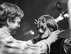 ![]() Leonard Whiting (t.h.) får en maske på under optagelser | |