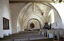 Den runde korbue med skråkantede kragsten er bevaret, men noget udvidet. Skibets vestende har fladt bjælkeloft, skibets østende og koret har sengotiske hvælv. Altertavlen er fra anden halvdel af 1600-tallet, tavlen blev stafferet i 1700-tallet på bekostning af Hans Rudolf Grabow til Bratskov og hustru Øllegård Rantzau, hvis våben ses i topstykket. Prædikestolen er fra begyndelsen af 1700-tallet. I korets nordvæg ses en gravsten over præsten Joh. Hornemann (død 1697).