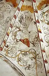 I skibets 1. fag i østkappen mod nord ses våben for Gøye, mod syd ses våben for Banner. Disse to våben er formodentlig anevåben for rigsmarsk Erik Eriksen Banner (1484-1554), Erik Banners mor var Karen Stensdatter Gøye og faderen var Erik Andersen Banner til Asdal og Kokkedal. I nordkappen mod øst ses våben for Rosenkrantz. I Danske kalkmalerier (1997) tolker Niels Matthias Saxtorph dette våben som et våben for Friis. Friis af Haraldskær havde et våben lig dette, men våbenet for Rosenkrantz havde også en skrå sort-hvid tern i blåt og rødt før 1524, efter 1524 blev der tilføjet to løver. Da der ikke er direkte familiære forbindelser til Friis, må våbenet tolkes som en Rosenkrantz, der knyttes til Mette Nielsdatter, som var Erik Banners 1.hustru, hendes far var Niels Eriksen Rosenkrantz til Bjørnholm, han døde i 1516.
