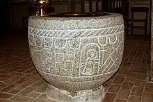 Den romanske døbefont af granit har primitive figurer, hvis betydning er uvis (Mackeprang 182). Kummen er udsmykket med en tovsnoning øverst og derunder nedadvendte tunger over en figurfrise. Til højre for en løvelignende figur ses en mur, der kan opfattes som en skillellinje. Læser man fontens kumme venstre om fra muren, ser man først en løve, en svært tolkelig figur, dernæst en slange over en taglignende konstruktion, Korsfæstelsen, en liggende figur, en stående figur, en fugl og en stående figur med sværd foran et kors.