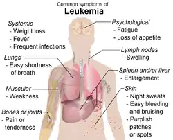 På grund af mangel på de normale celler: Leukocytter (hvide blodlegemer), erytrocytter (røde blodlegmer) og trombocytter (blodplader), vil de typiske symptomer være:[1]
