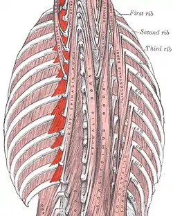 ![]() Dybe muskler på ryggen. (Levatores costarum markeret vertikalt centralt til venstre.) | |