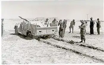 Et newzealandsk -bemandet LRDG køretøj udstyret med et Lewis maskingevær, graves ud af sandet, ca.1942.