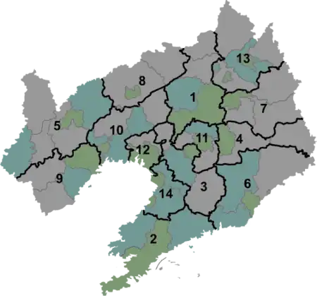 Disse 14 enheder på præfekturniveau er inddelt i 100 enheder på amtsniveau (56 distrikter, 17 byamter, 19 amter og 8 autonome amter). Disse er igen inddelt i 1.284 enheder på kommuneniveau.