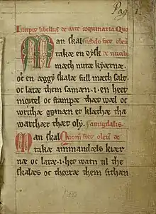 K7. Quomodo condiantur assature in salso supradicto. (Q5) Thawær man wil af hænnæ hauæ. tha skal man wællæ hænnæ wæl .i. en pannæ ofnæ hetæ gløthær utæn brandæ. oc skal man takæ brathæ af hiort ællær ra. wæl spækkæth oc stekæ them wæl. oc skæræ them wæl brethæ. oc thæn timæ thæn salsæ ær kald tha skal wildbrath .i. læggæs mæth litæt salt oc thæt ma lyggæ thre ukæ. Swa mughæ man haldæ goth hiortæ brath. giæs oc ændær. of man skær them thiokkæ. Thættæ ær the bæstæ salsæ thær hærræmæn hauæ.