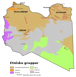 Et kort som viser sammensætningen af etniske grupper i Libyen.