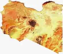 Oaser findes spredt over hele Libyen. Blandt de vigtigste er Ghadames og Kufra. Mere end 90 % af landets areal er ørken eller halvørken. Libyens højeste punkt er Bikku Bitti i Tibesti, med en højde på 2267 meter. Landets laveste punkt er Sabkhat Ghuzayyil, en sænkning som ligger 47 meter under havoverfladen.[13]