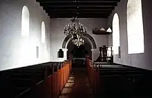 Apsis har bevaret sit halvkuppelhvælv. Skibet har bjælkeloft, korbuen er oprindelig, koret fik indbygget hvælv i sengotisk tid. Tårnfaget har haft herremandspulpitur, som nu er nedrevet, to vinduer mod vest har givet lys til pulpituret. Altertavlen er fra omkring 1600. Prædikestolen er et renæssancearbejde med malede allegorier fra 1700-tallet. Altertavle og prædikestol bærer adelsvåben, i prædikestolens felter ses pietistiske allegorimalerier. På de øverste stolegavle er malet årstallet 1642 og våben for Niels Krag og Jytte Høegs forældre. På tårnbuens nordpille ses en kalkmalet Sankt Peter med nøgle. I 1963 afdækkede E. Lind nogle kalkmalerier i skibet, de fleste blev atter overkalket, en toprosset er det eneste bevarede af en skabelseshistorie.