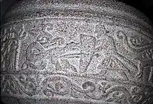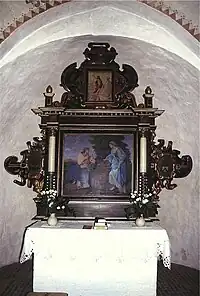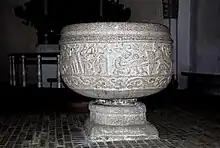 På kummen af den romanske døbefont af granit ses dragekamp og hjortejagt i ypperlig komposition, en mand med skjold og sværd kæmper mod en drage med flot svungen hale, en rytter med hund forfølger en hjort, desuden ses dyr ved livets træ samt to mænd i et hus, disse kan tolkes som Legenden om Seth, der bringer en kvist fra Livets træ til Adam. Motivet med krigerens kamp mod dragen er afbildet på den danske 500-kroneseddel.