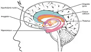 ![]() Det limbiske system består hovedsaglige af det der tidligere var kendt som den limbiske lap. | |