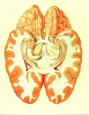 ![]() Tværsnit af den menneskelige hjerne der viser dele af det limbiske system nedefra. Traité d'Anatomie et de Physiologie (1786) | |