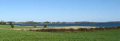 Nord for Lindelse Nor ligger herregården Fårevejle; mod vest ligger øen Strynø.
