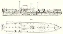 ![]() Lindormen i traditionel bemaling med mørkt skrog og gul skorsten, kanontårn m.v. | |