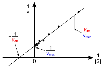 Det kan tydeligt ses, at 1/V plottet mod 1/[S] giver en lineær sammenhæng, hvor skæringen med x-aksen er , skæringen med y-aksen er , og hældningen er .[2][3]